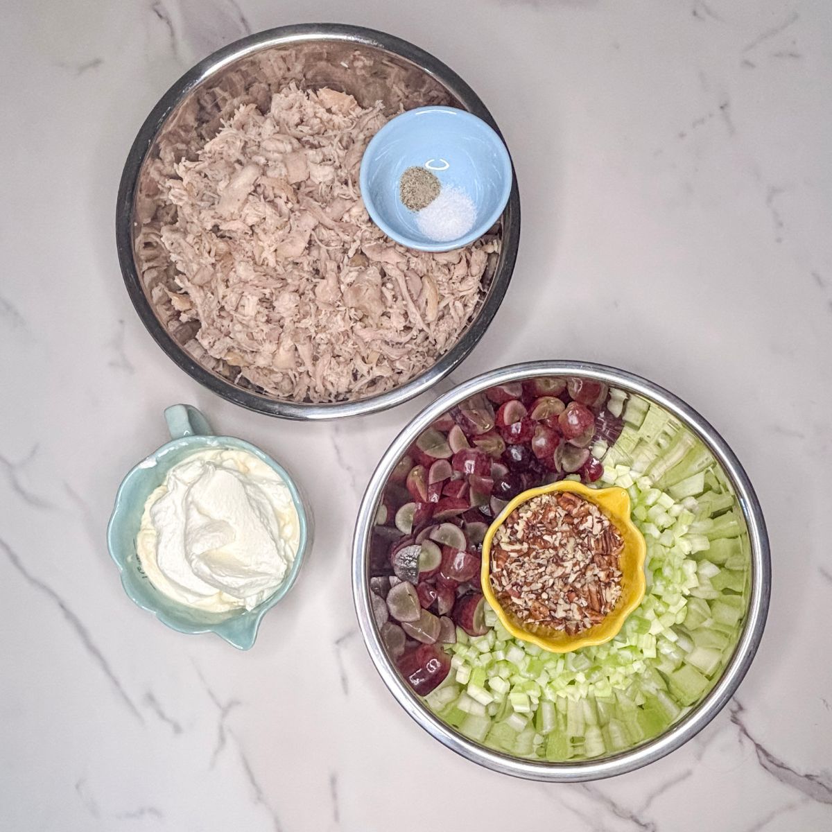 Step 4: Add the grapes, celery, pecans, and dressing to the chicken and mix thoroughly.