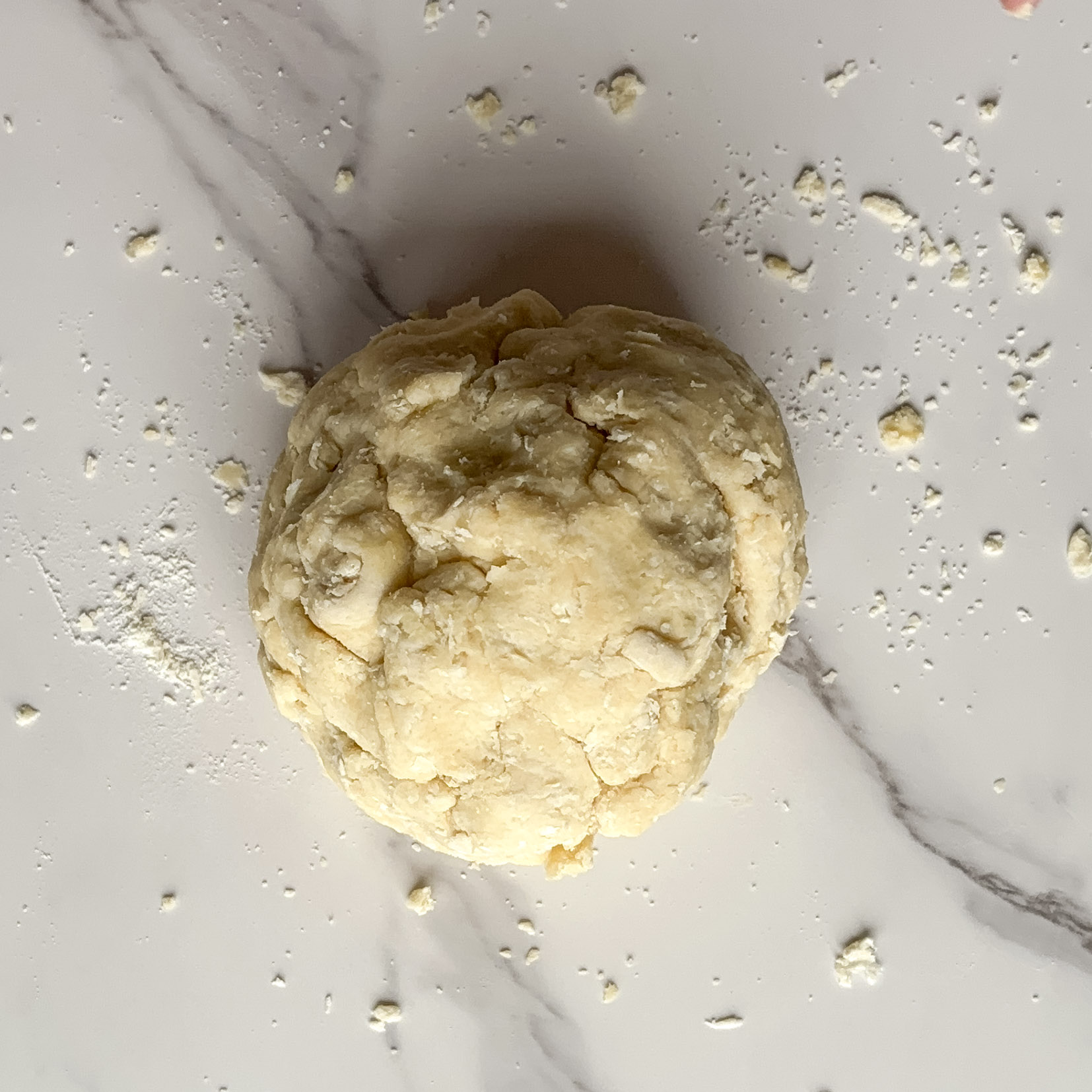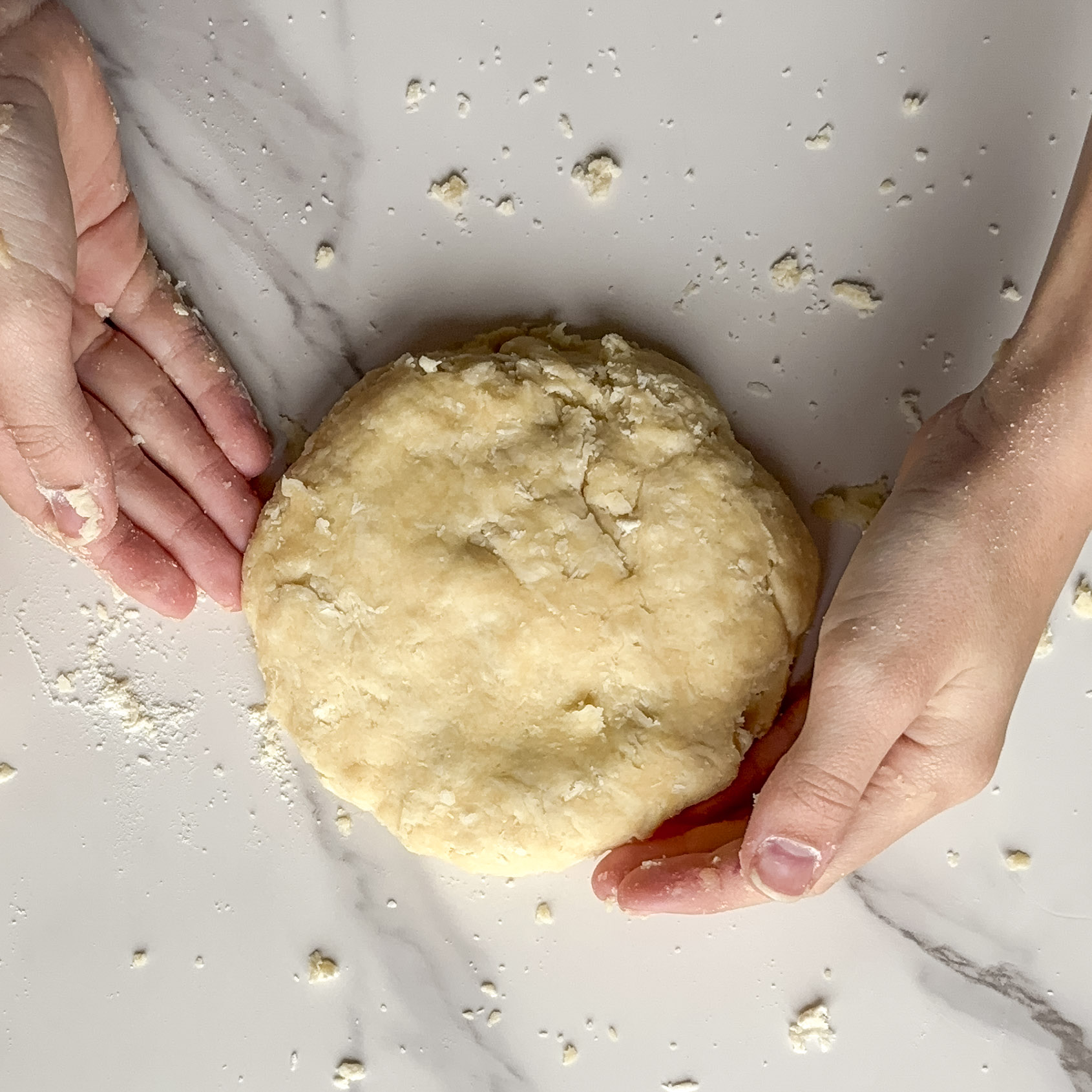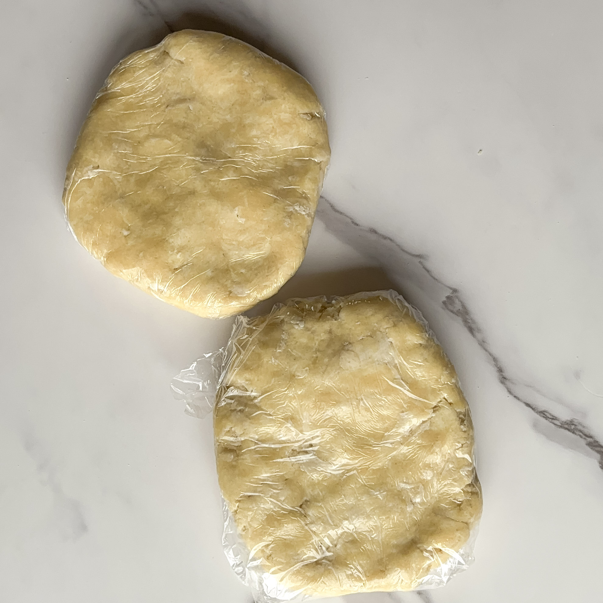 Step 4: Split the pie dough in two, shape into a round ball and flatten. Wrap with plastic wrap and refrigerate for 20 minutes before rolling.