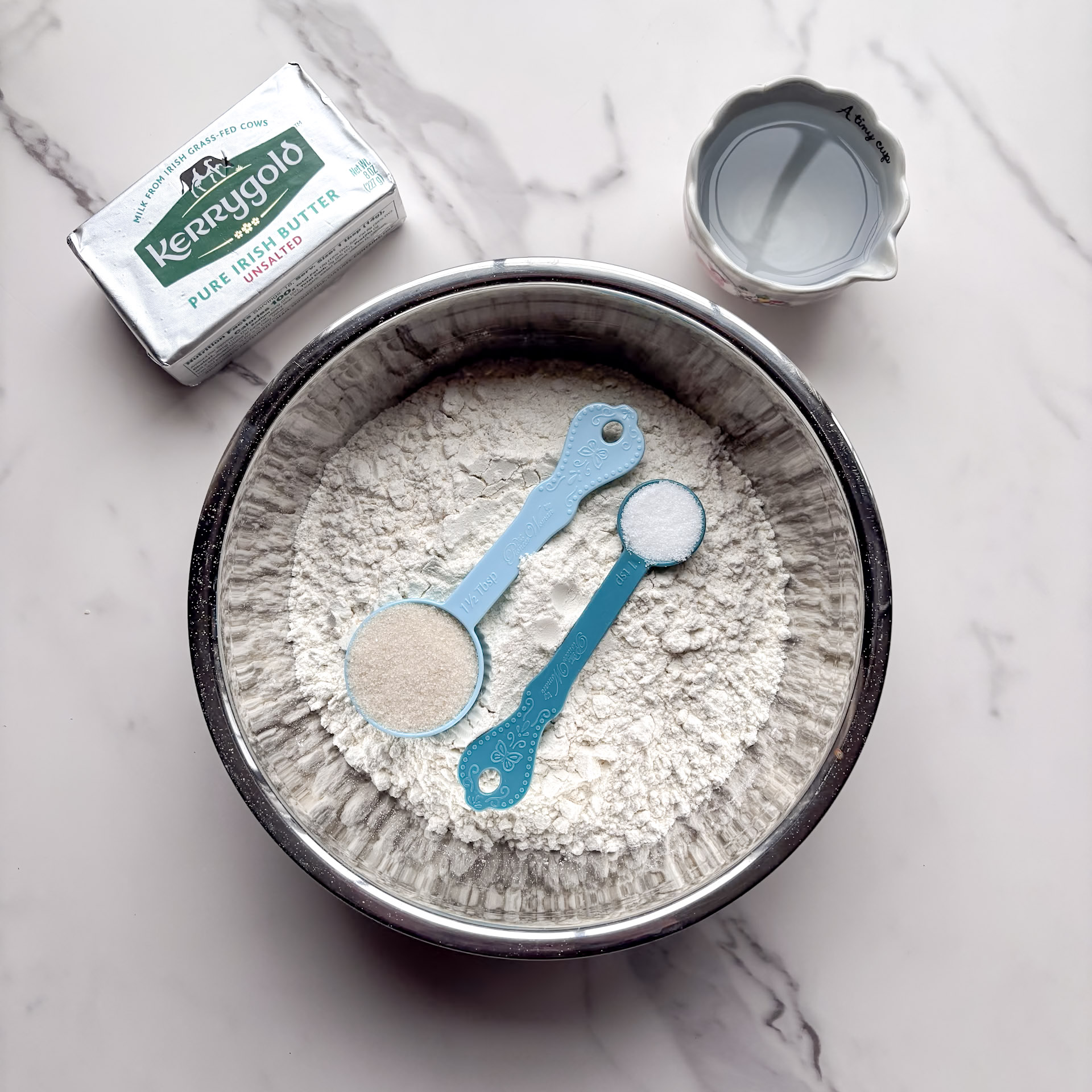 Step 1: Add flour, sugar and salt into a bowl and mix.