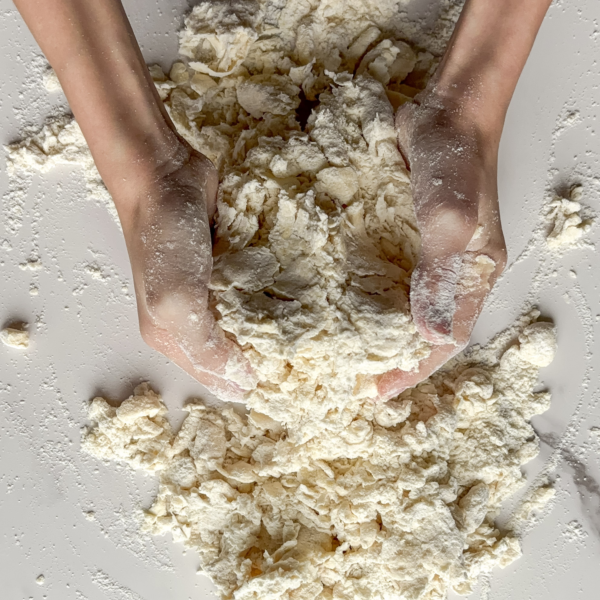 Step 3: Add four tablespoons of water into the pie crust and start mixing with your hands. Add three more tablespoons of cold water and continue mixing. If the dough is still too dry, add 1 more tablespoon of water and mix just until the dough comes together and there is no dry ingredients in the bowl.