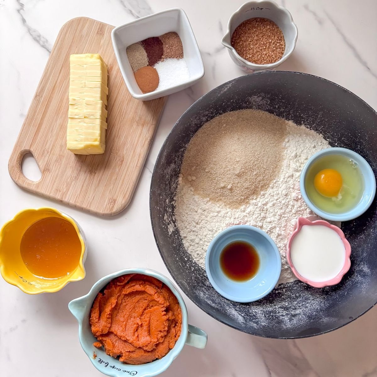 Vanilla and Spices. I like to keep my fall pastries subtle on the spices, yet have a crisp fall flavor in every bite. Cinnamon, cardamom, nutmeg, and cloves are my go-to fall spices.