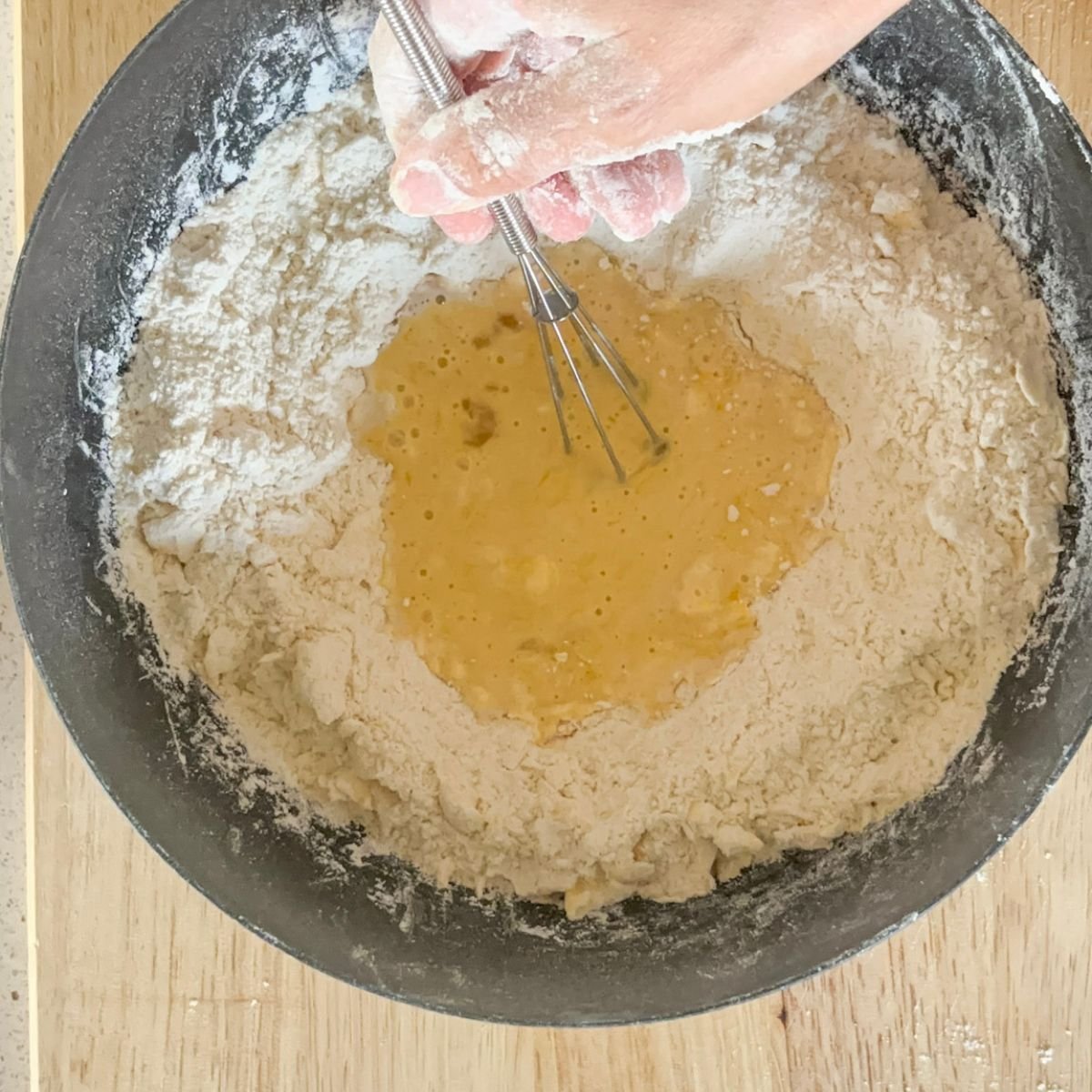 3. Start combining all the ingredients together. Use a dough whisk in the beginning. Once the wet ingredients have soaked up just enough of the flour, place the dough on a floured surface and continue to combine.