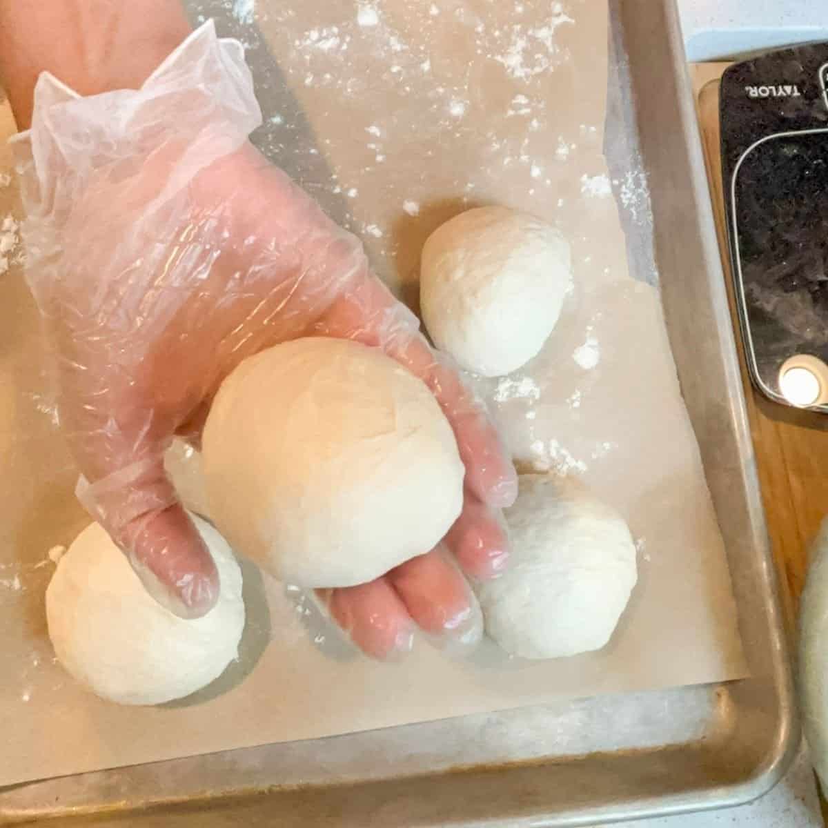 - Divide the dough into 12 pieces and shape them into round balls. Place onto a half sheet pan with parchment paper. You can squeeze all 12 pieces on one pan or use two half sheets to space them out.